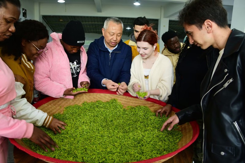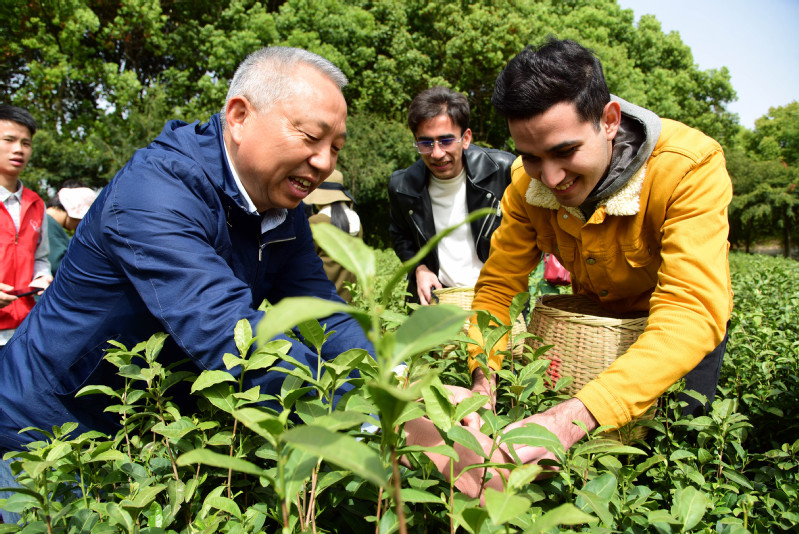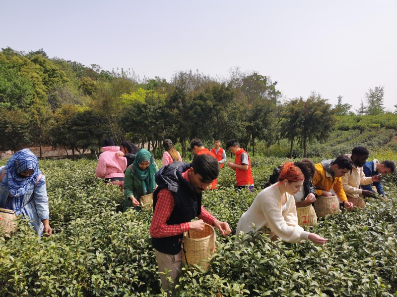 来自摩洛哥、巴基斯坦、孟加拉国、土库曼斯坦、乌克兰等国家的职工们和中国员工一起腰系茶篓在茶垄间接受着茶艺师的细心指导,学习采摘春茶,了解茶树的生长过程和茶叶制作工艺,在茶园大课堂里开心体验茶文化,增长新见识。他们跨越文化交流的障碍,探讨采茶的经验,交流不同国家的茶文化历史,共同接受茶文化的熏陶,彼此之间增进友谊。