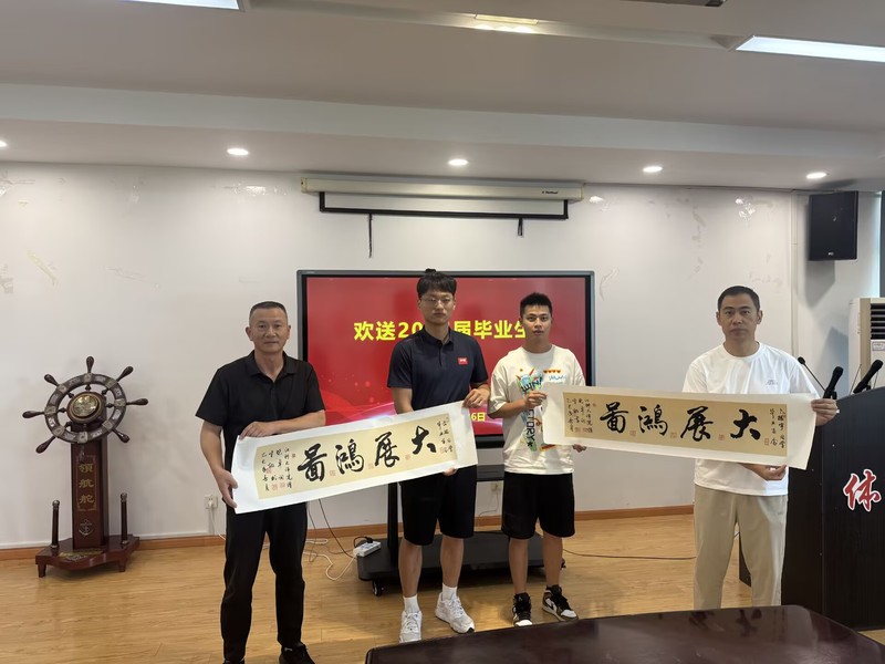 在温馨的氛围中,毕业生代表向公司赠送了精心准备的纪念品——“一帆风顺”和“桃李满天”摆件,寓意着学子们对母校的深厚情谊和对体育精神的传承。公司则回赠了每位毕业生姓名的定制的一副字,象征公司永远是学子们的坚强后盾。